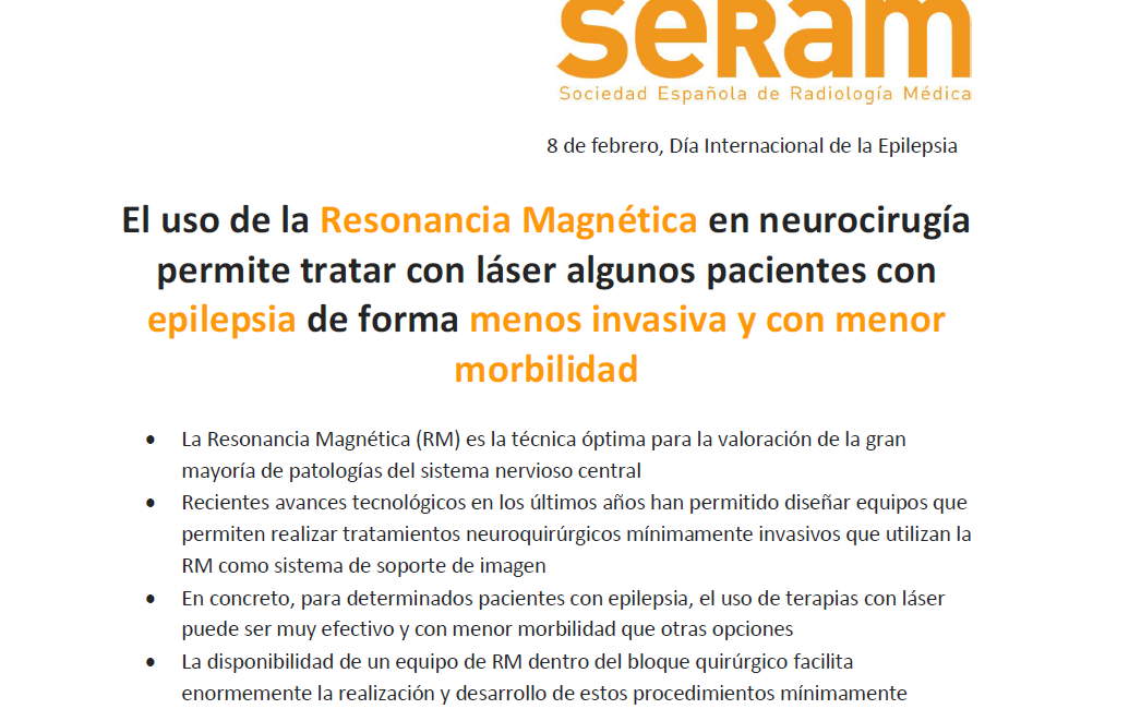 En el Día Internacional de la Epilepsia, la Sociedad Española de Radiología Médica (SERAM) expone que el uso de la Resonancia Magnética (RM) en la neurocirugía permite tratar algunos pacientes con epilepsia, con láser de forma menos invasivas, más efectiva y con menor morbilidad. La indicación de este tipo de...