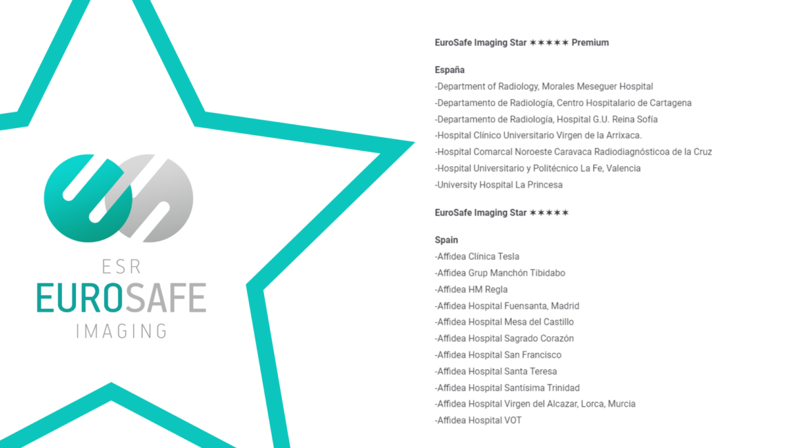 Esta es la lista de instituciones que han obtenido su estrella en el "Muro de la fama" de EuroSafe Imaging: EuroSafe Imaging Star ✶✶✶✶✶ Premium España-Department of Radiology, Morales Meseguer Hospital-Departamento de Radiología, Centro Hospitalario de Cartagena-Departamento de Radiología, Hospital G.U. Reina Sofía-Hospital Clínico Universitario Virgen de la Arrixaca.-Hospital Comarcal Noroeste...