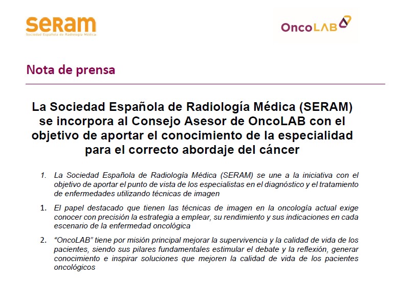 La Sociedad Española de Radiología Médica (SERAM) se incorpora al Consejo Asesor de OncoLAB con el objetivo de aportar el conocimiento de la especialidad para el correcto abordaje del cáncer