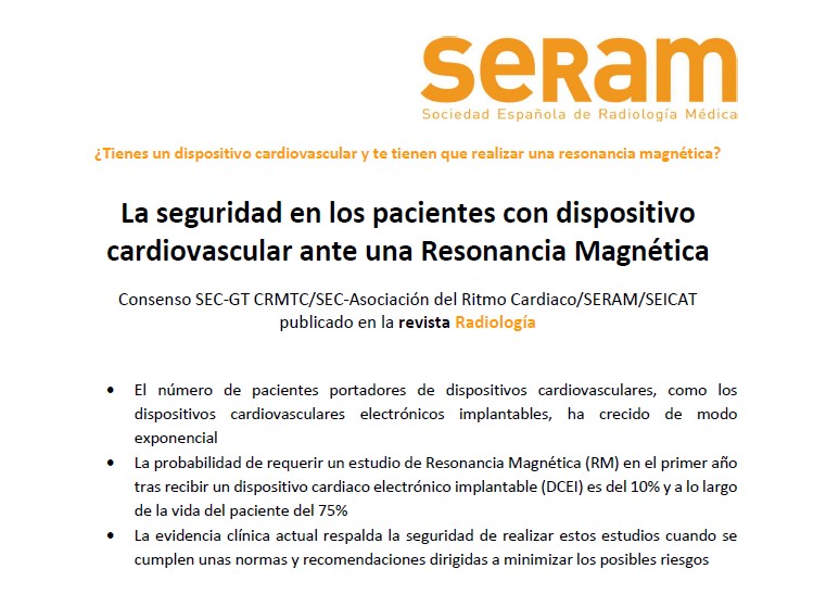 La seguridad en los pacientes con dispositivo cardiovascular ante una Resonancia Magnética (RM) es fundamental. Tal y como se reflejan en el artículo publicado en la revista Radiología “Resonancia magnética para portadores de dispositivos cardiovasculares. Consenso SEC-GT CRMTC/SEC-Asociación del Ritmo Cardiaco/SERAM/SEICAT” los autores. Se trata de un consenso entre el...