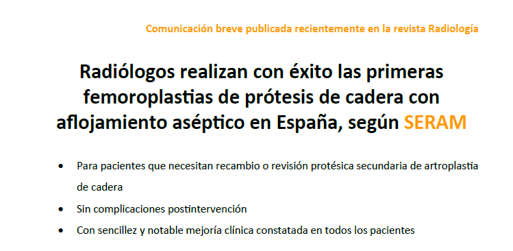 Los radiólogos realizan con éxito las primeras femoroplastias o cementación percutánea de prótesis de cadera con aflojamiento aséptico en España, según comentan los especialistas de la Sociedad Española de Radiología Médica (SERAM), los cuáles han publicado en la revista Radiología, órgano de expresión de dicha sociedad, en una comunicación breve...