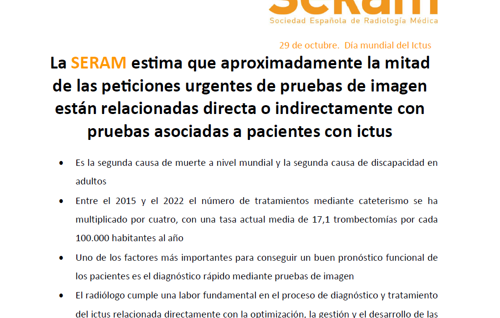 La Sociedad Española de Radiología Médica (SERAM) estima que aproximadamente la mitad de las peticiones urgentes de pruebas de imagen están relacionadas directa o indirectamente con pruebas asociadas a pacientes con ictus y en el contexto del día mundial del ictus reivindica la labor fundamental del radiólogo. La comisión de...