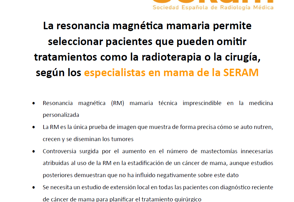 La resonancia magnética mamaria permite seleccionar pacientes que pueden omitir tratamientos como la radioterapia o la cirugía, según los especialistas en mama de la SERAM