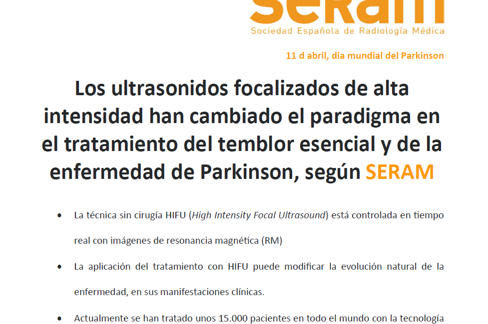 Los ultrasonidos focalizados de alta intensidad han cambiado el paradigma en el tratamiento del temblor esencial y de la enfermedad de Parkinson, según pone de manifiesto en el día mundial del Parkinson el Dr. Manuel Ramos, especialista de la Sociedad Española de Radiología Médica (SERAM) y neurorradiólogo del Hospital Universitario...