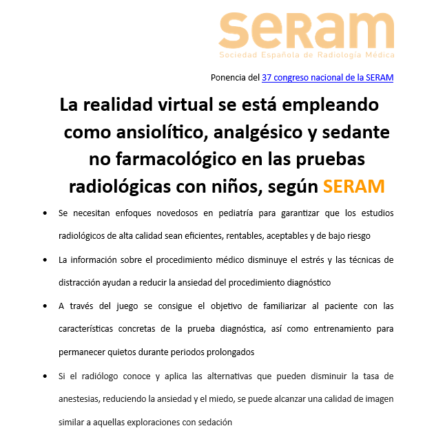 La realidad virtual se está empleando como ansiolítico, analgésico y sedante no farmacológico en las pruebas radiológicas con niños, según la Dra. Elisa Aguirre Pascual, especialista pediátrica de la Sociedad Española de Radiología Médica (SERAM) y ponente de la charla “nuevas estrategias para reducir la necesidad de sedación en pediatría”...