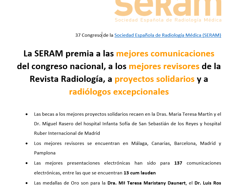 Barcelona, 24 de mayo de 2022. Dentro de su 37 Congreso, la Sociedad Española de Radiología Médica (SERAM) ha hecho entrega de premios que van desde las mejores comunicaciones, hasta el mejor proyecto solidario, pasando por los mejores revisores y la entrega de medallas de Oro a algunos radiólogos españoles...