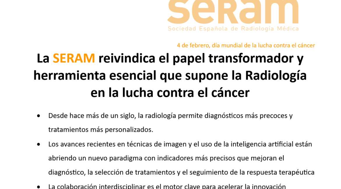 Desde la comisión de oncología de la Sociedad Española de Radiología Médica (SERAM), en el día mundial contra el cáncer, se reivindica el papel de la especialidad como herramienta esencial en la lucha contra el cáncer con un papel transformador en la detección y la atención del paciente oncológico. Las...