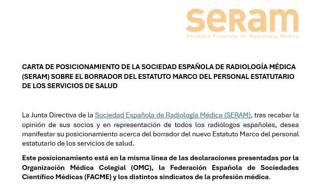 La Junta Directiva de la Sociedad Española de Radiología Médica (SERAM), tras recabar la opinión de sus socios y en representación de todos los radiólogos españoles, desea manifestar su posicionamiento acerca del borrador del nuevo Estatuto Marco del personal estatutario de los servicios de salud. Este posicionamiento está en la...