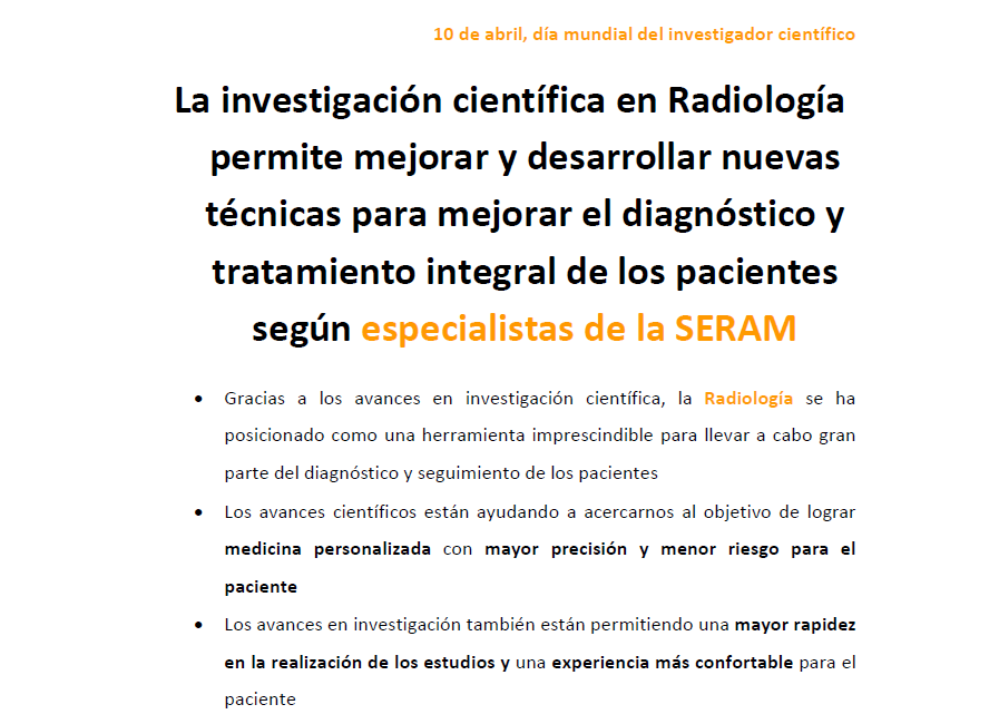 La investigación científica en Radiología permite mejorar y desarrollar nuevas técnicas para mejorar el diagnóstico y tratamiento integral de los pacientes según especialistas de la SERAM