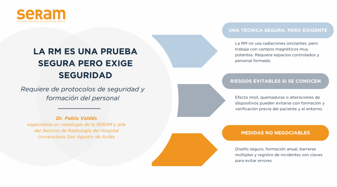 En el marco de la Semana Internacional de la Seguridad en RM, la Sociedad Española de Radiología Médica (SERAM) subraya la importancia de una cultura preventiva en torno a esta prueba diagnóstica. La resonancia magnética (RM)es una de las técnicas de imagen más precisas y versátiles en medicina. No utiliza radiaciones ionizantes y se considera segura para el paciente. Sin...