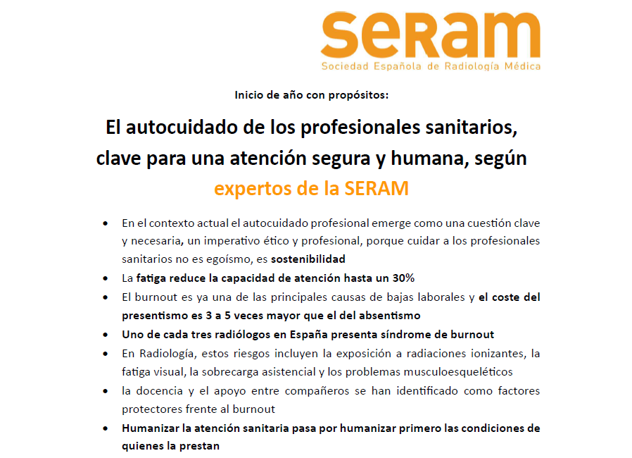 Como primer mes del año, eneroes tradicionalmente un momento de reflexión, balance y nuevos propósitos; por ello, desde la Sociedad Española de RadiologÃa Médica (SERAM) se pone de manifiesto que el autocuidado de los profesionales sanitarios es clave para una atención segura y humana. Los profesionales sanitarios afrontan enero con...