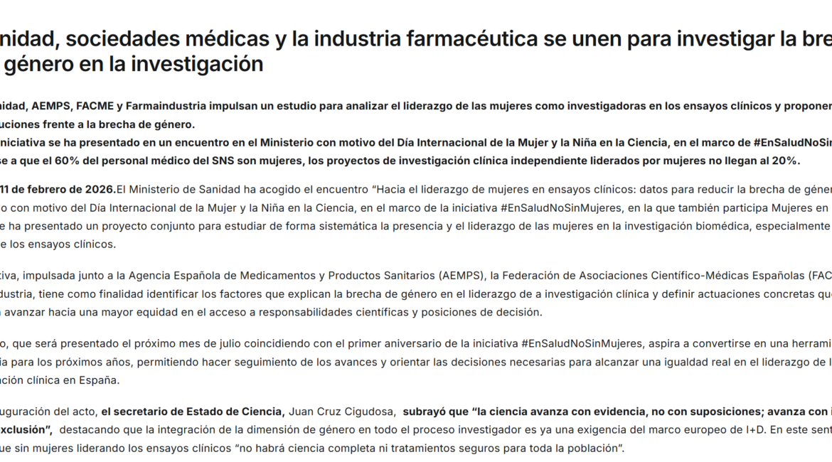 El Ministerio de Sanidad ha acogido el encuentro “Hacia el liderazgo de mujeres en ensayos clínicos: datos para reducir la brecha de género”, celebrado con motivo del Día Internacional de la Mujer y la Niña en la Ciencia, en el marco de la iniciativa #EnSaludNoSinMujeres, en la que también participa...