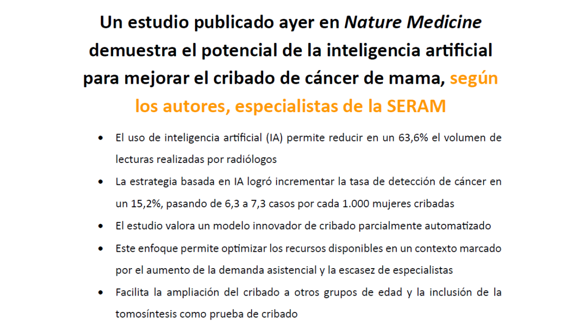 Un grupo de radiólogos especializados en mama pertenecientes a laSociedad Española de Radiología Médica (SERAM), como la Dra. Esperanza Elías Cabot, la Dra. Sara Romero Martín, el Dr. José Luis Raya Povedano y la Dra. Marina Álvarez Benito, han publicado un estudio pionero en la revista Nature Medicine titulado “AI-based...