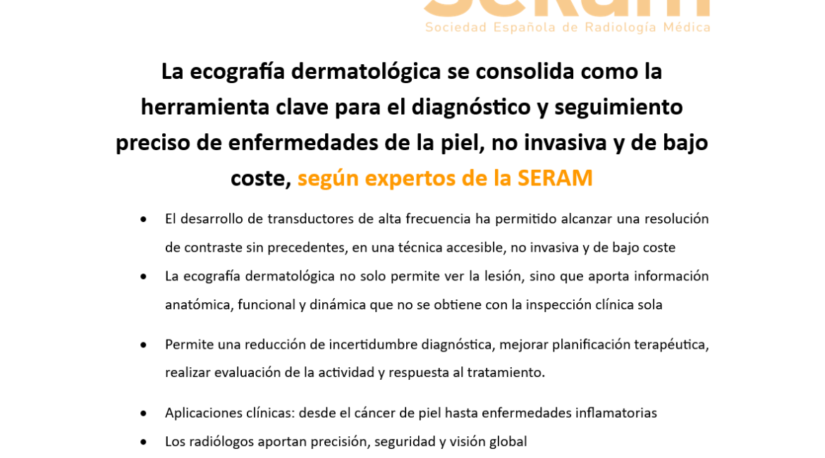 La ecografÃa dermatológica se consolida como técnica esencial en la práctica clÃnica moderna y herramienta clave para el diagnóstico preciso y el seguimiento de enfermedades de la piel, según expertos de la Sociedad Española de Radiologia Médica (SERAM), como la Dra. Elena Gallardo y ponente del Curso Internacional SEUS. Sin...