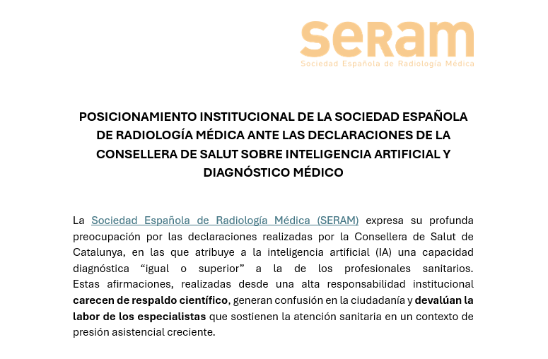La Sociedad Española de Radiología Médica (SERAM) expresa su profunda preocupación por las declaraciones realizadas por la Consellera de Salut de Catalunya, en las que atribuye a la inteligencia artificial (IA) una capacidad diagnóstica “igual o superior” a la de los profesionales sanitarios.Estas afirmaciones, realizadas desde una alta responsabilidad institucional...