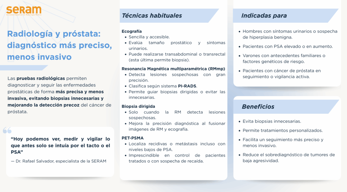 Las pruebas radiológicas permiten diagnosticar la patología prostática de forma más precisa y menos invasiva, lo que ayuda a evitar biopsias innecesarias, facilita una detección precoz del cáncer de próstata y permite una planificación personalizada del tratamiento, así como un seguimiento más eficaz, según especialistas de la Sociedad Española de...