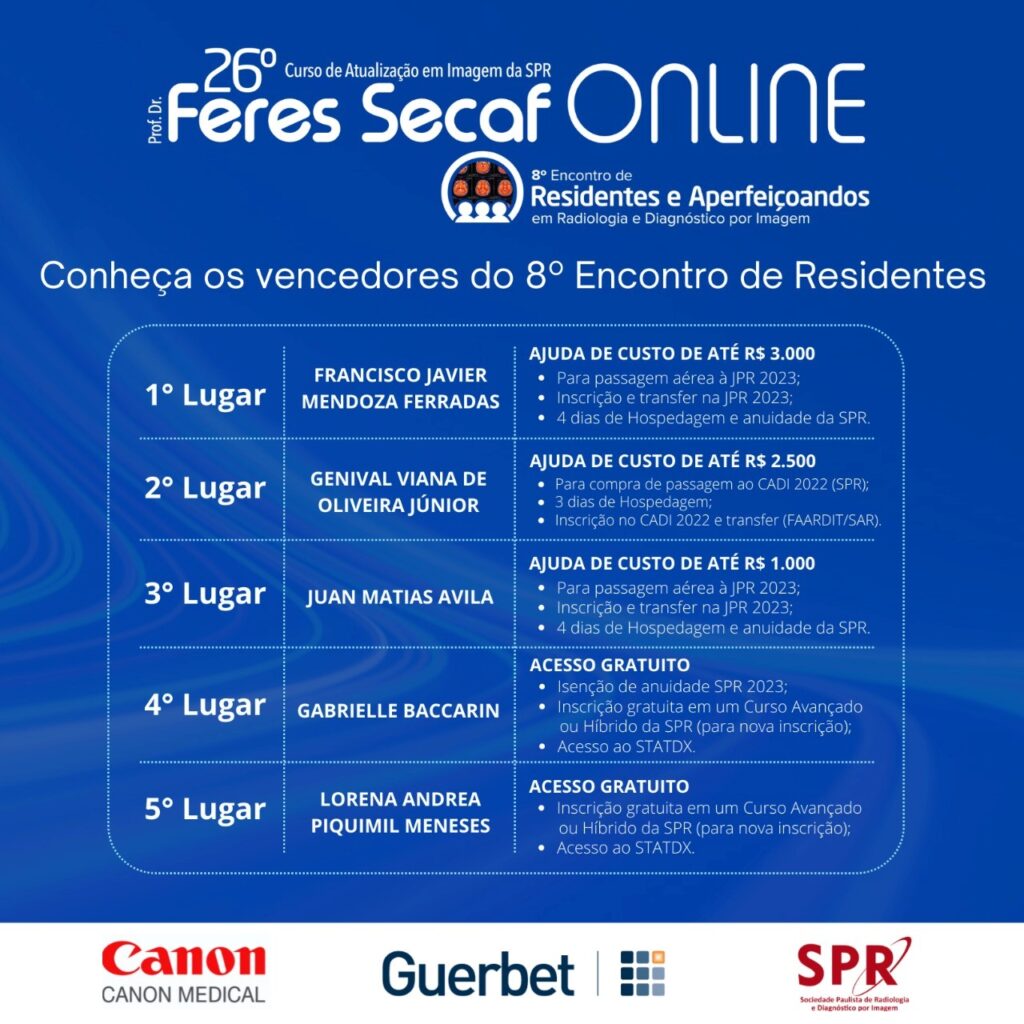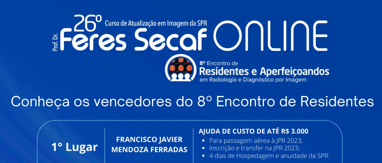 El Dr. Francisco Javier Mendoza Ferradas fue seleccionado para participar en el 8º Encuentro de Residentes y Alumnos de Perfeccionamiento en Radiología y Diagnóstico por Imagen de la Sociedad Paulista de Radiología donde participó con el caso completo: “Mediolisis Arterial Segmentaria (MAS)” que presentó en la sesión de discusión de casos del día 27 de agosto de 2022, por el cuál ha sido seleccionado con el primer premio.