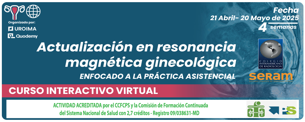 La SERAM oferta 2 plazas gratuitas para socios de número de la SERAM al corriente de pago (1 para especialistas y 1 para residentes) para participar en el curso "Actualización en resonancia magnética ginecológica; Enfocado a la práctica asistencial" que se celebrará durante 4 semanas de forma virtual, del 21 de abril al 20 de mayo de 2025.
