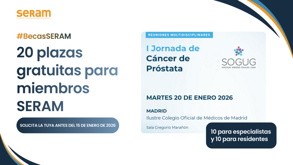 La SERAM oferta 20 plazas gratuitas para socios de número de la SERAM al corriente de pago (10 para especialistas y 10 para residentes, pudiéndose cambiar la asignación de inscripciones entre ambos grupos en caso de que alguno quedara desierto) para participar en el curso "I REUNIÓN MULTIDISCIPLINAR SOGUG DE CÁNCER DE PRÓSTATA - Reunión multidisciplinar " que se celebrará de forma presencial en el Ilustre Colegio Oficial de Médicos de Madrid el día 20 de enero 2026.