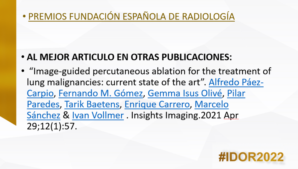 El Dr. Alfredo Páez Carpio, al mejor trabajo publicado en otras revistas por el artículo “Image-guided percutaneous ablation for the treatment of lung malignancies: current state of the art”.