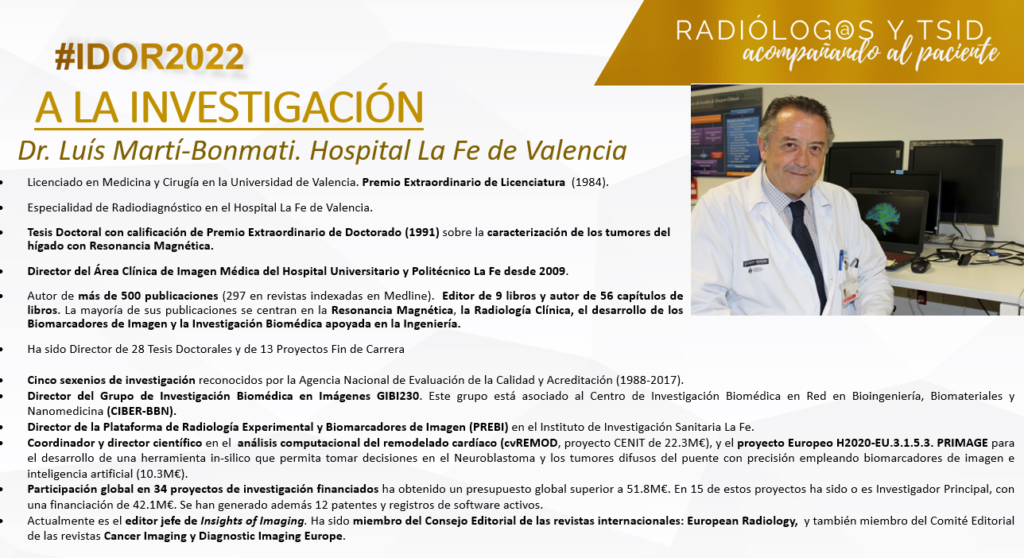 Premio a la investigación para el Dr. Luís Martí-Bonmatí, jefe de Servicio de Radiología del Hospital Universitario de la Fe en Valencia, recogió el premio la presidenta de la SERAM, Dra. Asunción Torregrosa Andrés.