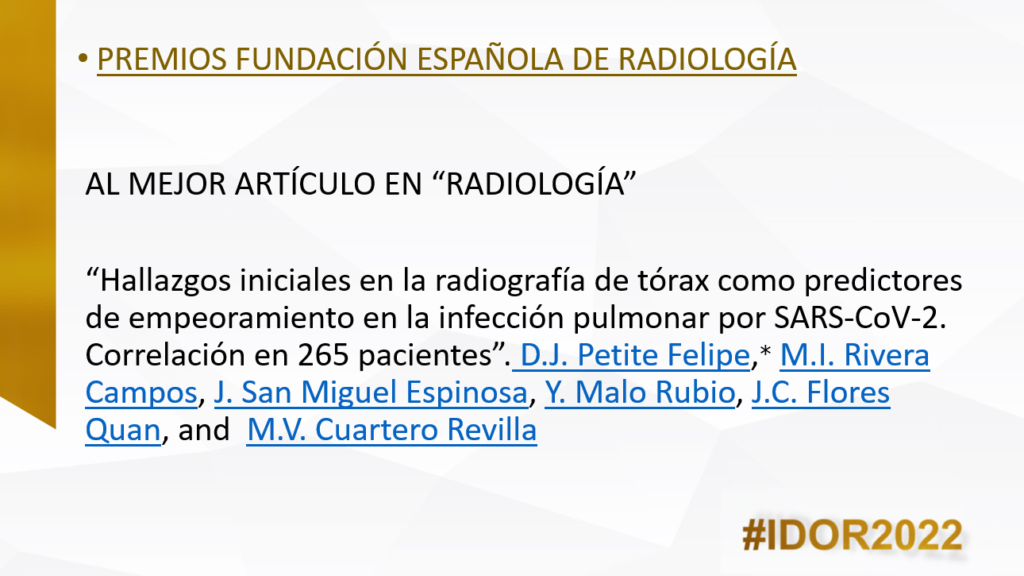 Premio al mejor artículo publicado en la revista Radiología al Dr. David José Petite Felipe, primer autor del artículo “Hallazgos iniciales en la radiografía de tórax como predictores de empeoramiento en la infección pulmonar por SARS-CoV-2. Correlación en 265 pacientes”.