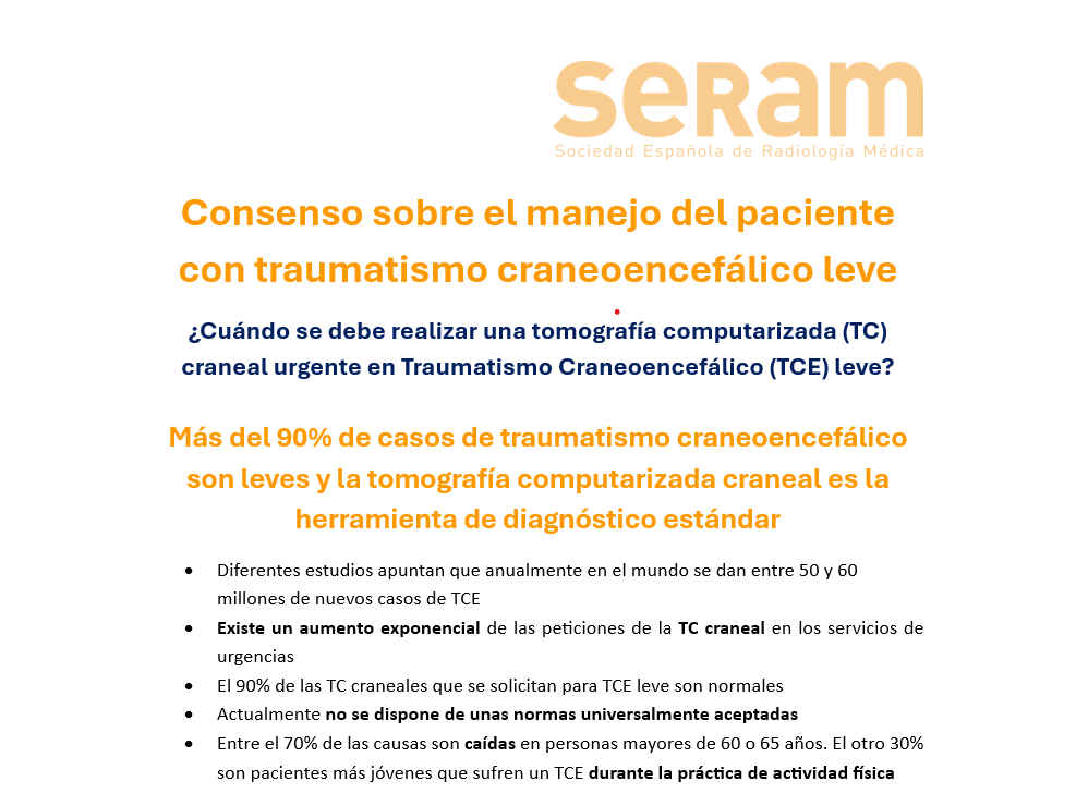 En el mundo ocurren entre 50 y 60 millones de nuevos casos de TCE al año, de los cuáles se estima que más del 90% son leves, y actualmente la TC craneal es la herramienta de diagnóstico estándar para evaluar la lesión intracraneal de pacientes con algún grado de traumatismo craneoencefálico. Sin embargo, hoy en día no se dispone de unas normas universalmente aceptadas sobre cuándo se debe realizar una tomografía computarizada (TC) craneal urgente en traumatismo craneoencefálico (TCE) leve. Y el uso de estos protocolos a nivel español es centro dependiente, lo que implica que no hay una homogeneidad entre comunidades autónomas, áreas sanitarias y centros de una misma región en cuanto al uso de un consenso, ruta, protocolo, guía o manual de actuación común para el manejo del paciente con TCE leve. Por ello, desde la Sociedad Española de Radiología Médica (SERAM), junto a su sección de urgencias (SERAU), la Sociedad Española de Medicina de Urgencias y Emergencias (SEMES), la Sociedad Española de Medicina de Laboratorio (SEQCML), la Sociedad Española de Neurocirugía (SENEC) y la Asociación Española de Médicos de Equipos de Fútbol se ha elaborado, participado y avalado un consenso sobre el manejo del paciente con traumatismo craneoencefálico leve.
