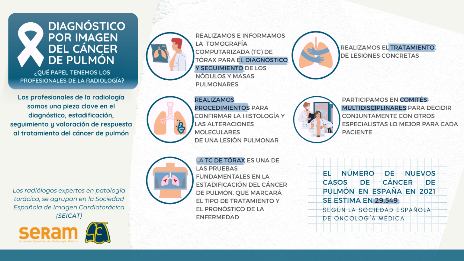Desde la SERAM hoy queremos poner de manifiesto que los profesionales de la radiología somos una pieza clave en el diagnóstico, estadificación, seguimiento y valoración de respuesta al tratamiento del cáncer de pulmón: