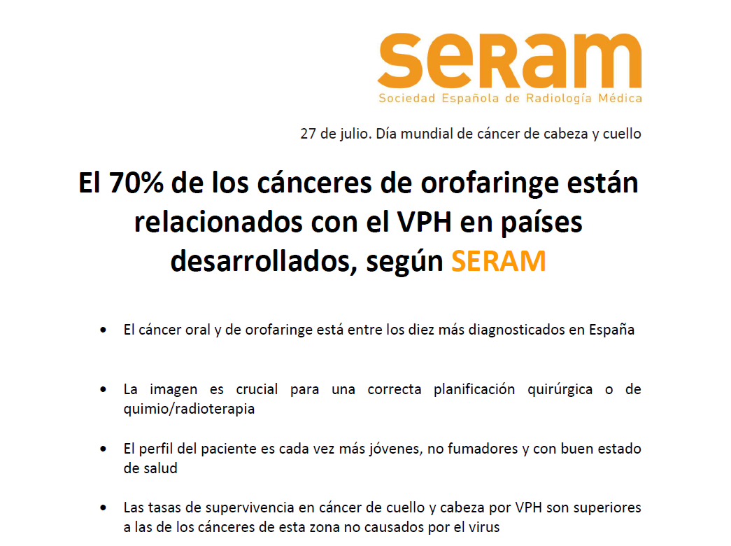 En el día mundial de cáncer de cabeza y cuello desde la Sociedad Española de Radiología Médica (SERAM) se pone de manifiesto que aproximadamente el 70% de los cánceres de orofaringe están relacionados con el VPH en países desarrollados y representa el 18% de todos los casos de cáncer de cabeza y cuello.