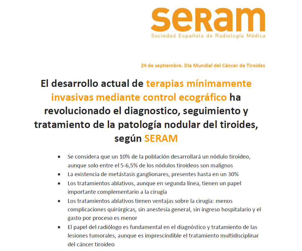 El desarrollo actual de terapias mínimamente invasivas mediante control ecográfico ha revolucionado el diagnostico, el seguimiento y el tratamiento de la patología nodular del tiroides, ponen de manifiesto especialistas de la Sociedad Española de Radiología Médica (SERAM), de cara al próximo día Mundial del Cáncer de Tiroides.
