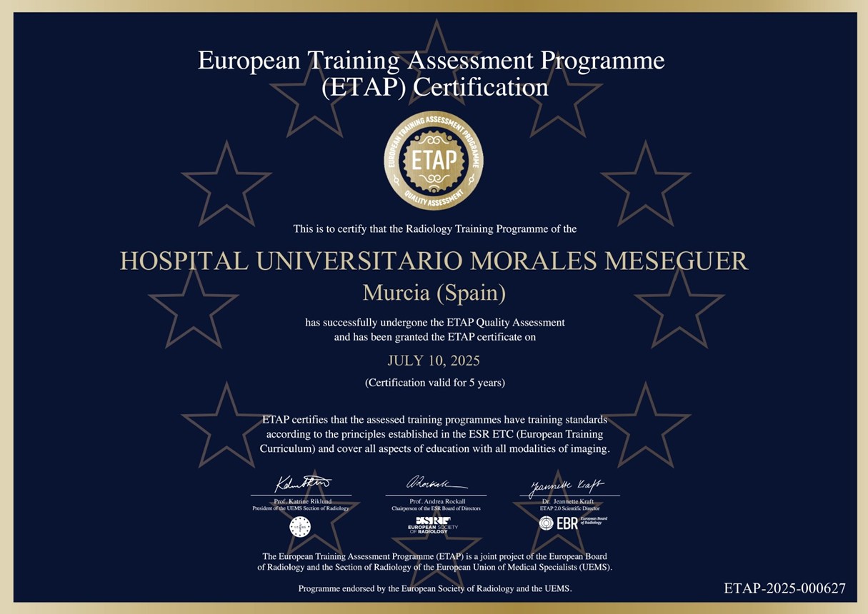 El servicio de Radiología del Hospital Morales Meseguer ha renovado la acreditación europea ETAP 2.0 unidad postgrado
