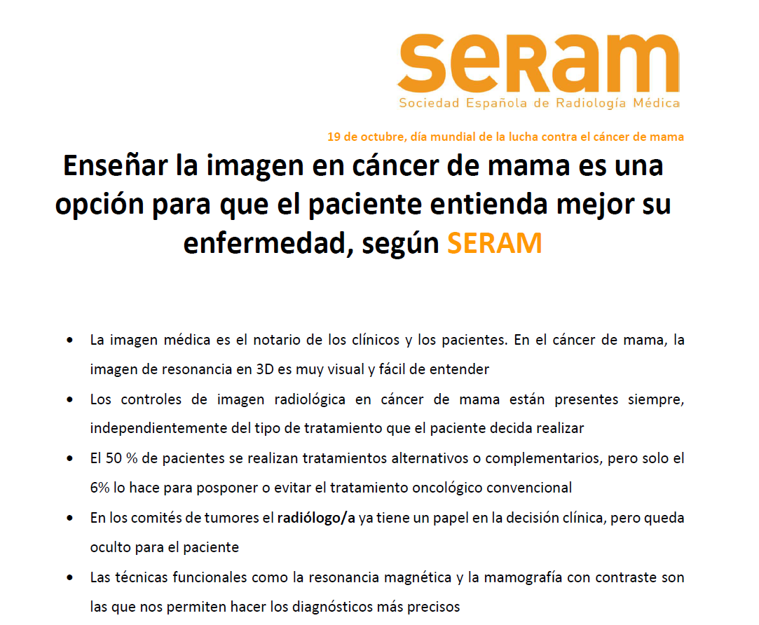 En el mes de la lucha contra el cáncer de mama, desde la Sociedad Española de Radiología de Mama (SERAM) se quiere poner de manifiesto la importancia y fuerza de la imagen en cáncer de mama, ya que es tan espectacular que es una opción enseñarla para ayuda al paciente a que entienda mejor su enfermedad, según la Dra. Pilar Manchón, radióloga especialista en mama de la SERAM y directora médica regional de los centros médicos Affidea España.Explica que “en mi experiencia la imagen ayuda a aceptar la enfermedad y dimensionarla. Para algunas personas es un alivio ver el tamaño. Su imaginación muchas veces los lleva a temer por una enfermedad mayor de la real”.