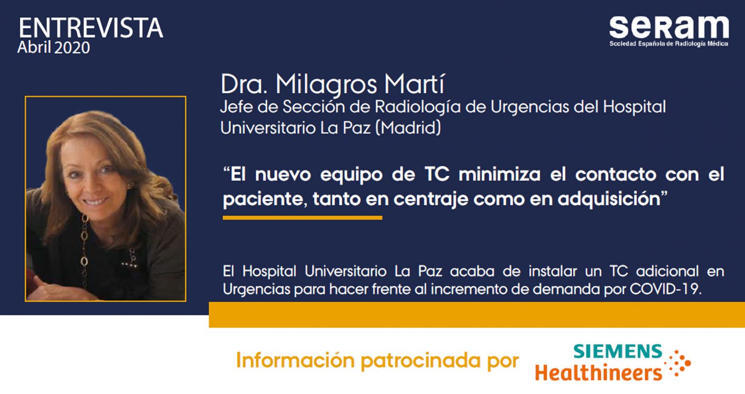 La Dra. Milagros Martí nos habla en esta entrevista del nuevo equipo de TC de Siemens instalado en el Hospital Universitario de La Paz de Madrid para hacer frente al incremento de demanda por COVID-19. La jefa de sección de Radiología de Urgencias en este centro hospitalario y vicepresidenta de la SERAM destaca, en este momento de crisis sanitaria, que tenga la capacidad de explorar un elevado número de pacientes y mantener al técnico absolutamente aislado e independiente.