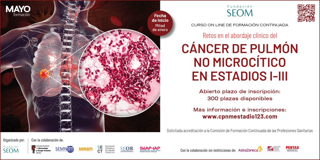 Curso online de formación continuada "Retos en el abordaje clínico del cáncer de pulmón no microcítico en estadios I-III" organizado por la Fundación SEOM y avalado científicamente por varias sociedades científicas de prestigio, entre las que se encuentra la SERAM.