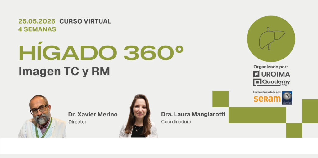 Curso 100% online, con material disponible 24/7 durante el desarrollo del mismo. El curso aborda, de manera actualizada, integral y eminentemente práctica, un amplio espectro de patologías hepáticas, con el objetivo de servir al alumno como una guía de referencia clara y útil. Está dirigido tanto a residentes de Radiología como a radiólogos en ejercicio que deseen profundizar y consolidar sus conocimientos en imagen hepática por TC y RM.