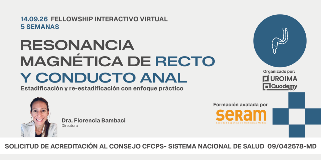 Fellowship Online que abordará los aspectos más importantes para la correcta interpretación de la Resonancia Magnética de pelvis en la estadificación y re- estadificación del cáncer de recto y conducto anal. Se aportará material grabado con clases teóricas actualizadas de corta duración con enfoque práctico, casos clínicos interactivos con resolución y webinars sincrónicas semanales. La formación está dirigida a médicos radiólogos especialistas y residentes asi como a profesionales médicos involucrados en el manejo del cáncer colorrectal como cirujanos del aparato digestivo, oncólogos médicos y radioterápicos.