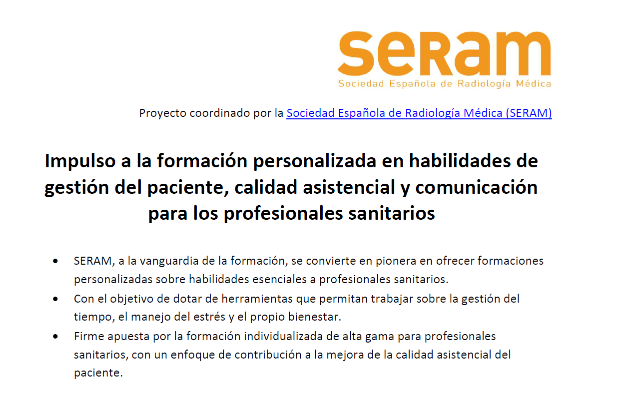 Madrid, 20 de abril del 2022. Desde la Sociedad Española de Radiología Médica (SERAM) se impulsa la formación personalizada en habilidades de gestión del paciente, calidad asistencial y comunicación para todos los profesionales sanitarios. Se lanza el curso con el objetivo de dotar de herramientas que permitan mejorar la realidad diaria a los trabajadores de la salud sobre la gestión del tiempo, el manejo del estrés y su propio bienestar, que a su vez repercute directamente en una mejora asistencial de los pacientes.