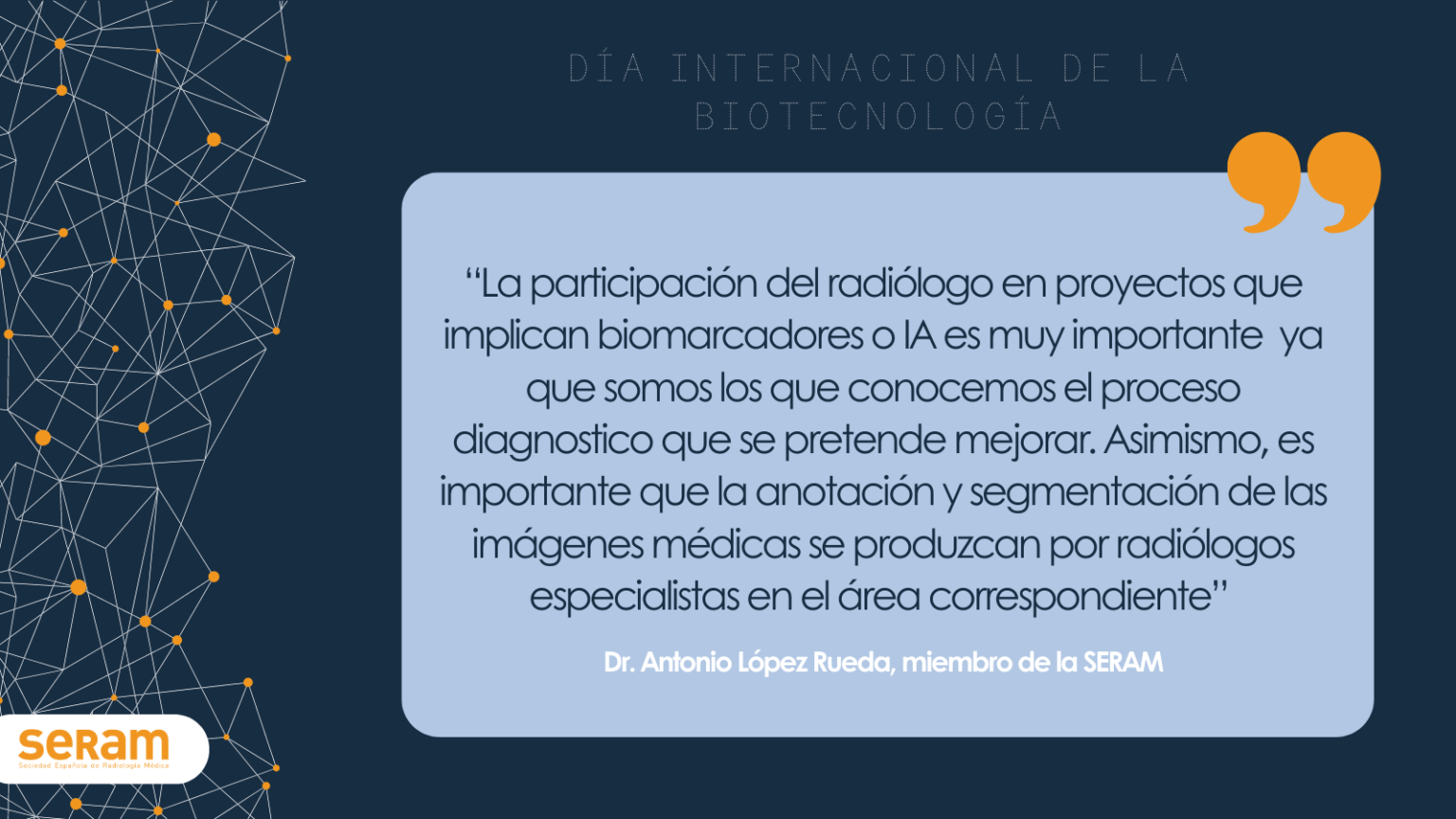 La creación de grupos multiprofesionales con radiólogos son la clave para poder hacer la implementación de biomarcadores de radiómica y algoritmos de inteligencia artificial, según comenta el Dr. Antonio López Rueda, miembro de la Sociedad Española de Radiología Médica y participante de un grupo donde se integran los proyectos de IA vinculados a la imagen del Hospital Clinic de Barcelona, en el día internacional de la biotecnología.
