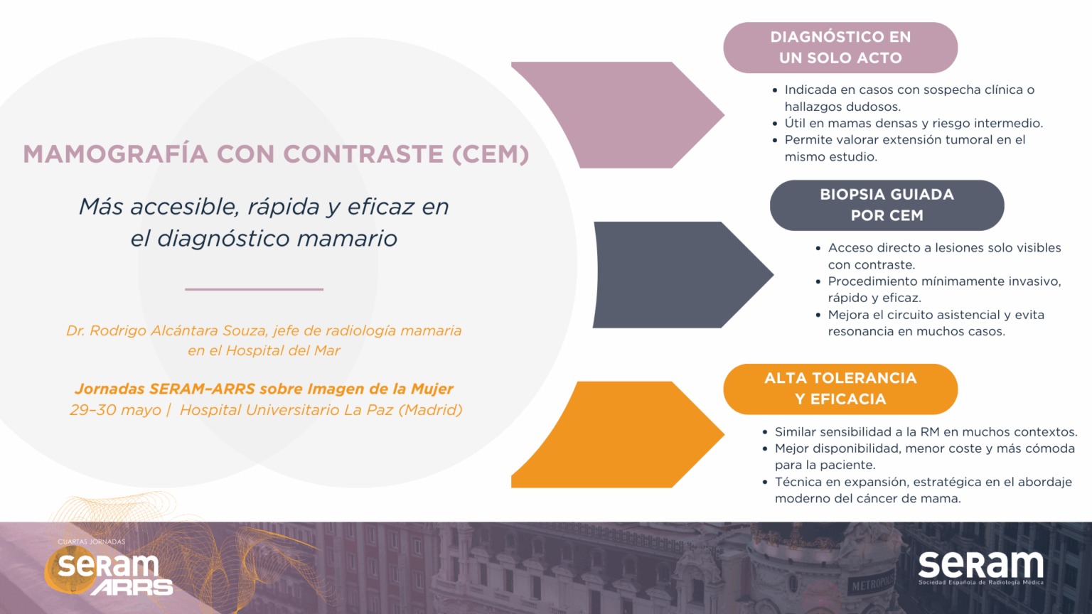 La mamografía con contraste permite mayor rapidez, accesibilidad y capacidad de detección en un solo acto diagnóstico, según especialistas en mama de la Sociedad Española de Radiología Médica (SERAM), como el Dr. Rodrigo Alcántara Souza, jefe de la unidad de radiología mamaria del Hospital del Mar, y ponente del curso SERAM-ARRS sobre “Imagen de la Mujer” que se celebrará los próximos 29 y 30 de mayo.