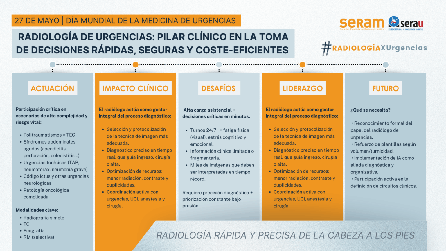 Con motivo del Día Mundial de la Medicina de Urgencias, desde la Sociedad Española de Radiología Médica (SERAM) y, su sección, la Sociedad Española de Radiología de Urgencias (SERAU) queremos poner en valor el papel esencial del radiólogo en los entornos de urgencia y emergencia. Su intervención es decisiva en la toma de decisiones clínicas críticas, especialmente en situaciones de alta complejidad y riesgo vital.