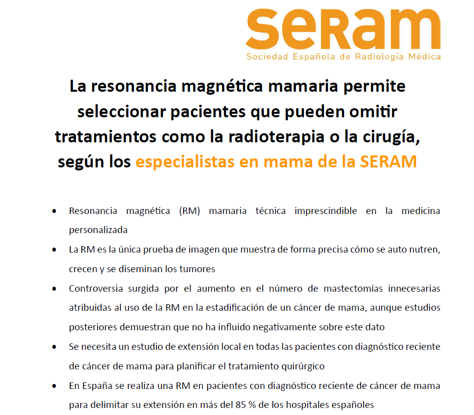 La resonancia magnética mamaria permite seleccionar pacientes que pueden omitir tratamientos como la radioterapia o la cirugía, según los especialistas en mama de la SERAM