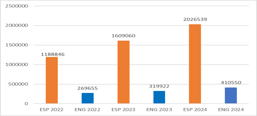 El gráfico anterior señala el promedio de descargas de la Revista Radiología cuantificadas desde Google Analytics y Science Direct con fecha de diciembre de 2024. La barra naranja muestra las descargas en español y la barra azul las descargas en inglés. Observamos como las descargas en ambos idiomas han ido aumentando progresivamente desde 2022 hasta 2024. Datos cedidos por Elsevier España. Publicados en: García Villar C. Un nuevo año, una nueva ilusión. Radiología 2025.  2:113-4. Doi: 10.1016/j.rx.2025.01.002