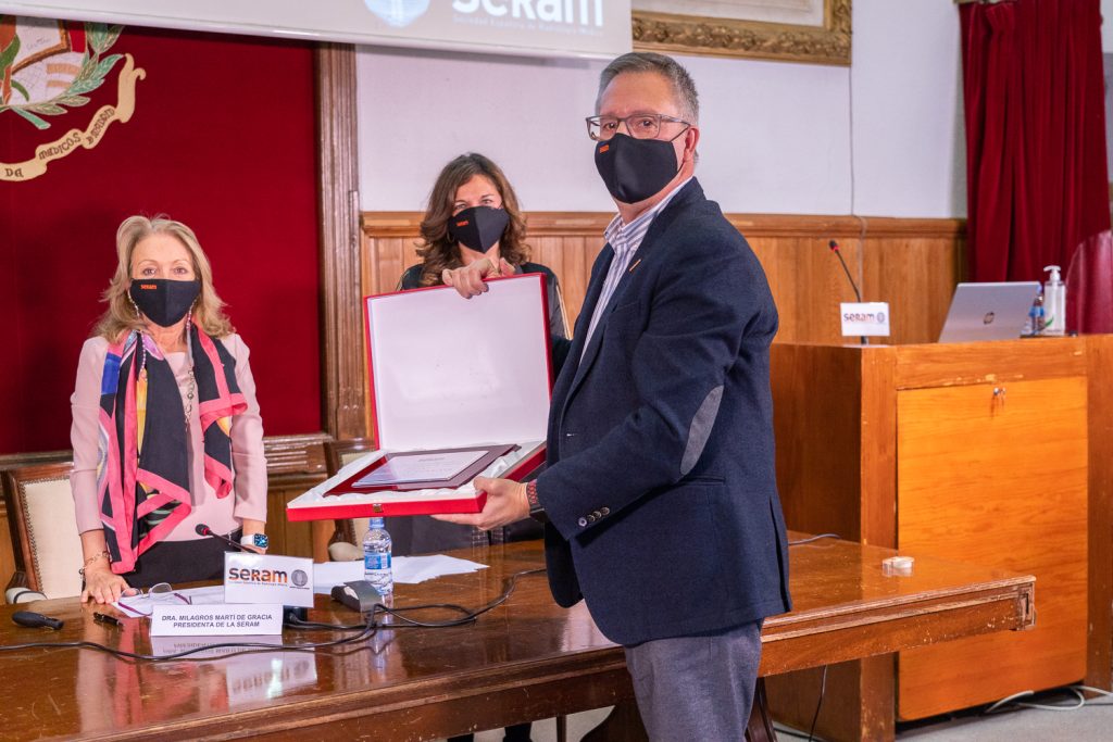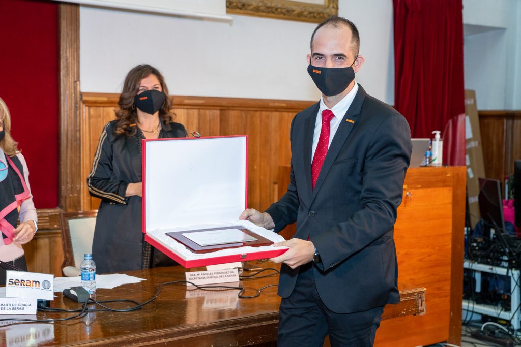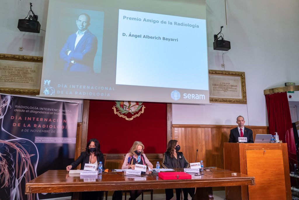 Por último, la SERAM entregó el Premio Amigo de la Radiología a D. Ángel Alberich-Bayarri, Ingeniero de Telecomunicaciones y Doctor en Ingeniería Biomédica por la Universidad Politécnica de Valencia, en reconocimiento a sus investigaciones sobre la aplicación de técnicas de procesado de imagen avanzadas a imágenes de resonancia magnética. Alberich es fundador y director de la empresa QUIBIM (Quantitative Imaging Biomarkers in Medicine), dedicada al análisis avanzado de imágenes médicas, y director científico-técnico del Grupo de Investigación Biomédica en Imagen del Hospital Universitario y Politécnico La Fe de Valencia.