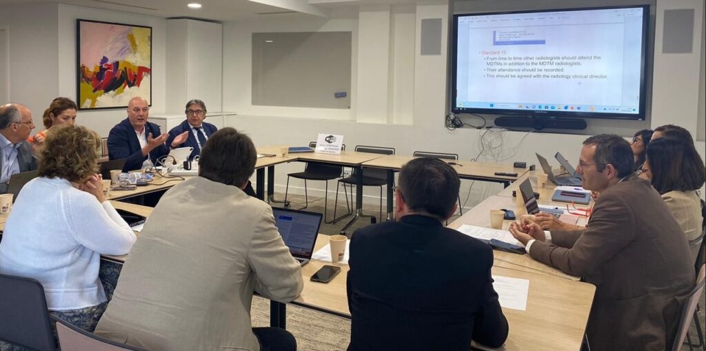 Además se continuó en las líneas de trabajo comenzadas en reuniones previas que buscan converger en la redacción de documentos con recomendaciones y estándares que puedan ser avalados por las tres sociedades. En concreto se debatió y generó el esquema correspondientes a teleradiología y a la participación de radiólogos en comités multidisciplinares. Respecto a este último, SERAM presentó los resultados de la encuesta de estado en España que se realizó el pasado año en colaboración con las Dras. Viteri y Puyalto, actualmente en fase de análisis y que será publicado próximamente en radiología.