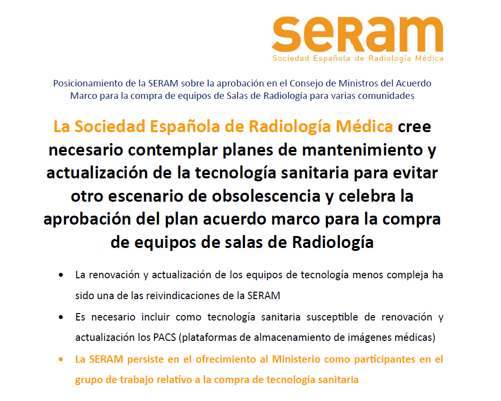 Posicionamiento de la SERAM sobre la aprobación en el Consejo de Ministros del Acuerdo Marco para la compra de equipos de Salas de Radiología para varias comunidades
