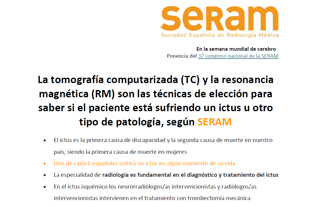 La tomografía computarizada (TC) y la resonancia magnética (RM) son las técnicas de elección para saber si el paciente está sufriendo un ictus u otro tipo de patología, según SERAM