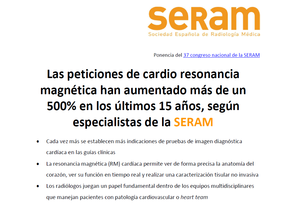 Se calcula que las peticiones de cardio resonancia magnética (RM) han aumentado más de un 500% en los últimos 15 años, según el Dr. Roque Oca Pernas, especialista en imagen cardíaca de la Sociedad Española de Radiología Médica (SERAM) y ponente del 37 congreso nacional de la SERAM, que se celebrará del 22 al 25 de mayo en Barcelona, con la ponencia “Imagen cardiaca eficiente: protocolos rápidos en el contexto de una demanda alta y creciente”.