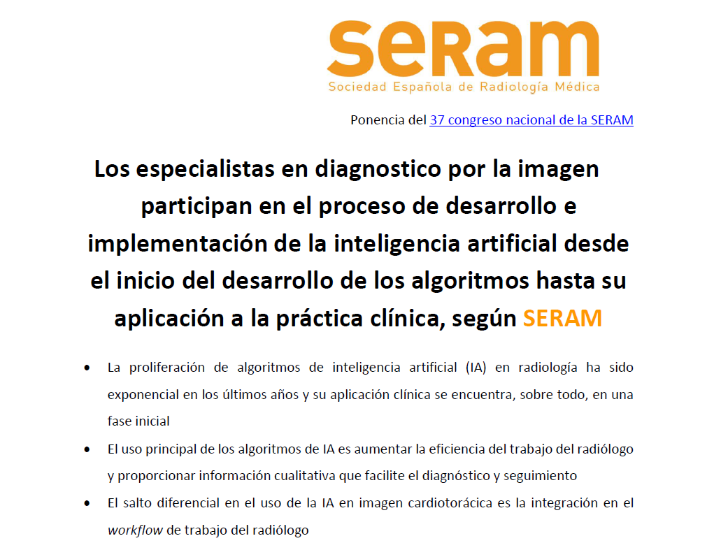 Los especialistas en diagnostico por la imagen participan en el proceso de desarrollo e implementación de la inteligencia artificial desde el inicio del desarrollo de los algoritmos hasta su aplicación a la práctica clínica, según SERAM