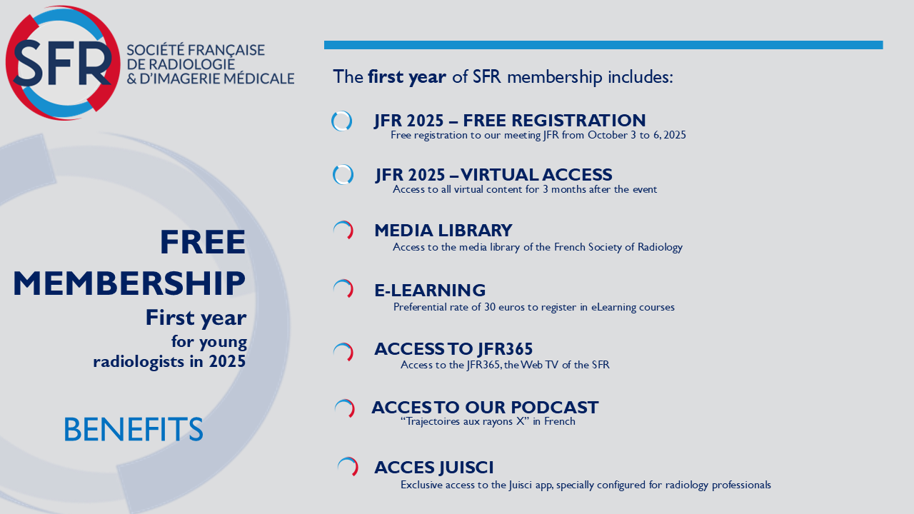 En virtud del acuerdo de colaboración que la SERAM mantiene con la Sociedad Francesa de Radiología (SFR), esta ofrece una membresía gratuita para el año 2025 a cualquier residente socio de SERAM (menor de 35 años) que se inscriba por primera vez a la SFR.