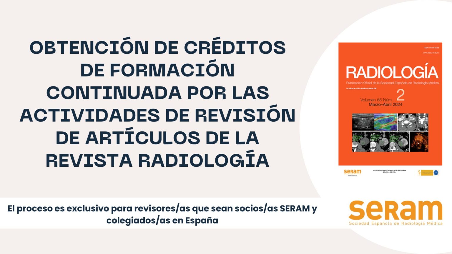 El proceso es exclusivo para revisores/as que sean socios/as SERAM y colegiados/as en España y se realizará anualmente desde el Comité Editorial de Radiología y la Comisión de Formación SERAM de manera que los revisores/as no tendrán que hacer ningún trámite adicional.